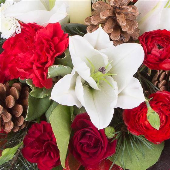 A beautiful, traditional table centre. Cones and ribbon give this arrangement a seasonal feel without the sparkle.