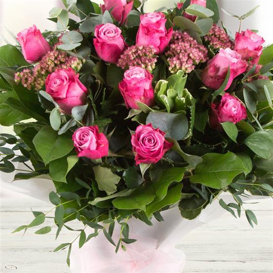 A dozen classic long stemmed pink roses mingled with mixed foliage presented in water.