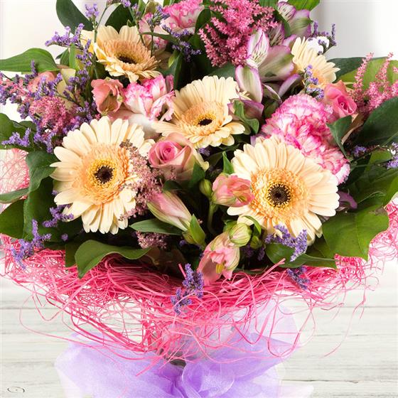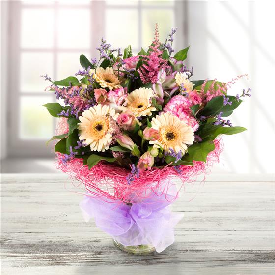 A delightful bouquet of pretty lilac, pink and peach flowers in a sisal wrap presented in a glass vase.
