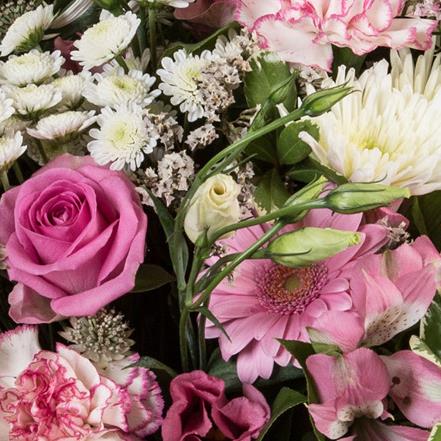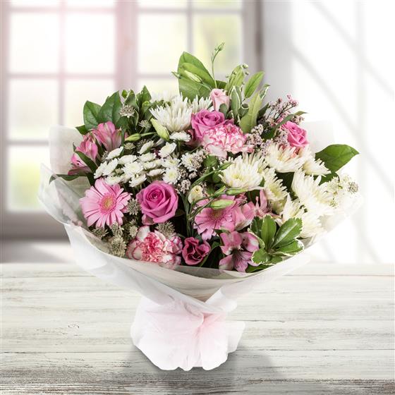 Our most popular bouquet, a collection of blooms in shades of pink and cream, hand-tied and finished with a complementary wrap.