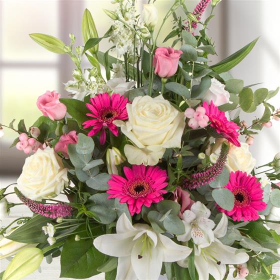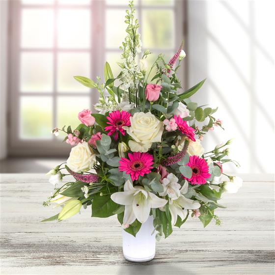 A tall, front facing modern arrangement in cerise and contrasting whites, including scented lilies, roses and veronica.