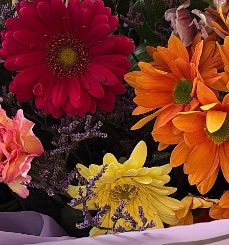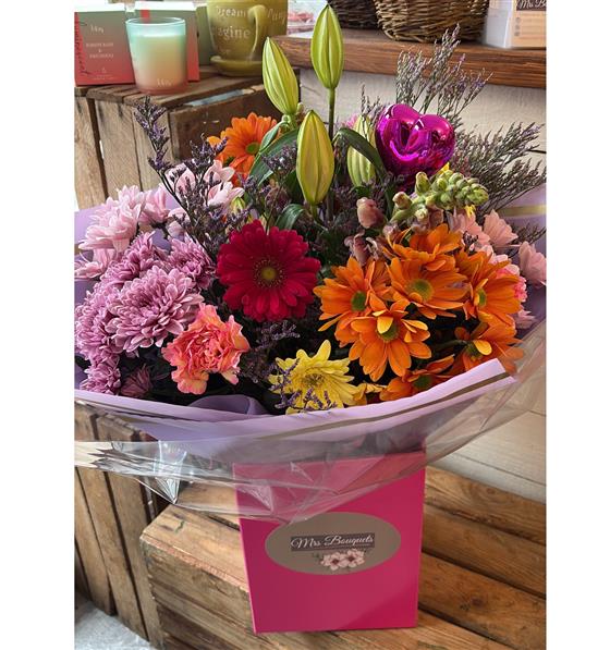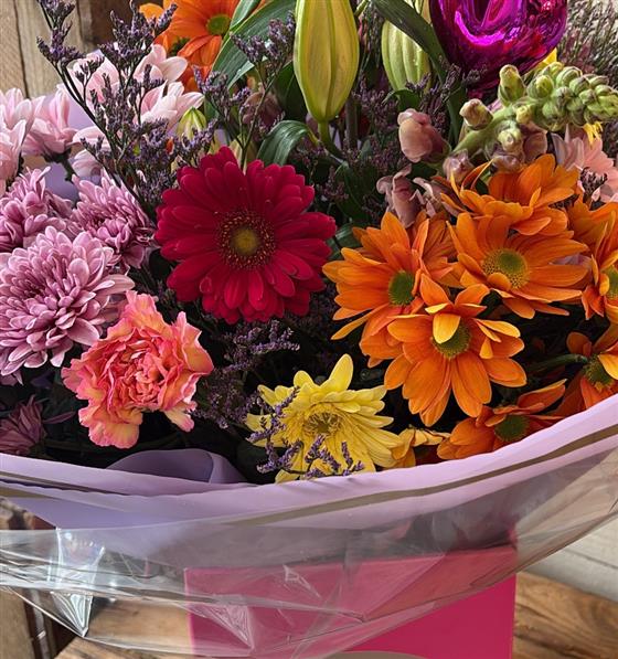 A popular bouquet, a collection of blooms in shades in bright and bold colours, hand-tied and finished with a complementary wrap.